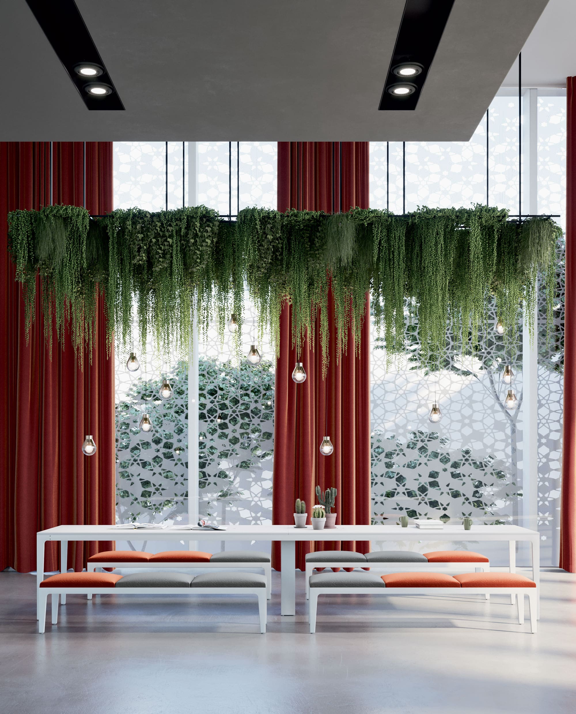 The Alplus upholstered bench stands out for its lightweight yet sturdy painted aluminium frame and its soft, clean lines, which make it an elegant addition to any setting. Comfort is guaranteed by generous padding, ideal for providing a pleasant and relaxed seating experience even during prolonged use.