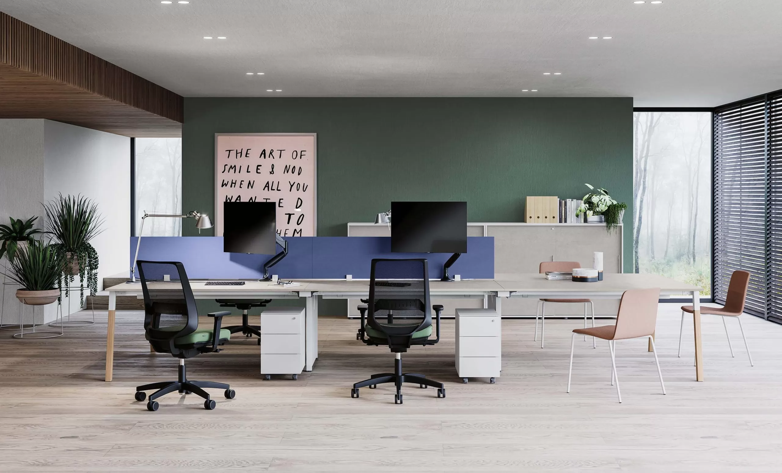 Les bureaux bench Pop Woody permettent d'optimiser les espaces de travail en fonction des besoins des différentes activités.