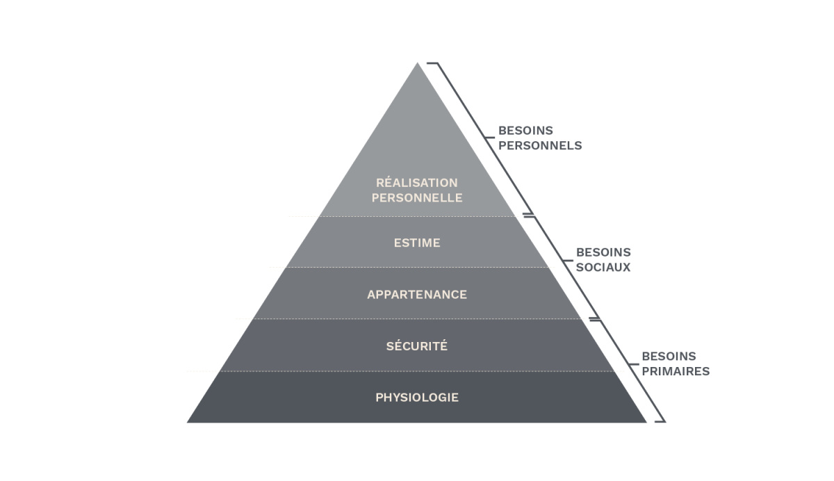 La pyramide des besoins de Maslow est basée sur cinq niveaux, les « leviers des motivation » de l’individu. A la base on trouve les besoins fondamentaux et incontournables, tandis qu’au sommet on trouve le but : la réalisation de l’individu.